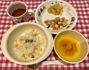 ツナコーン炒飯 味噌汁(かぼちゃ・玉ねぎ) 高野豆腐の煮物 キャベツのごま和え
