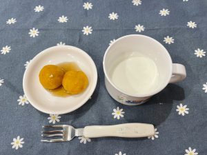 本日のおやつは、「みたらしかぼちゃ」です。お皿に残った甘いみたらしのあんまで、おいしそうに完食していました。