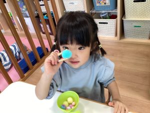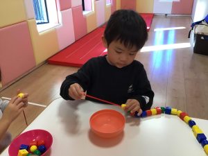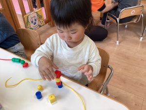 「ネックレスにして~👸」と紐通ししたものでごっこ遊びをする姿も😊