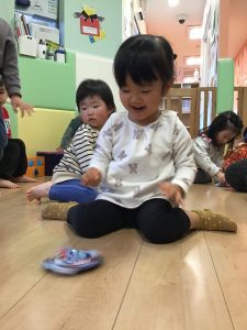 クルクル回るコマに釘付けの1歳児さんでしたよ😊