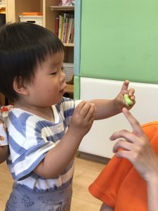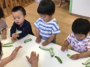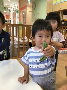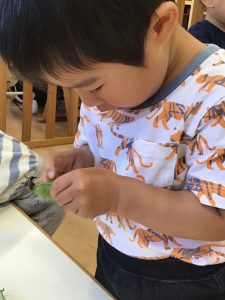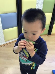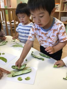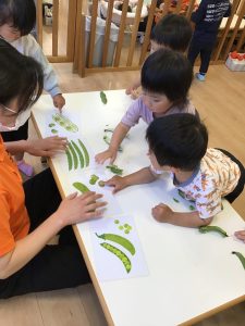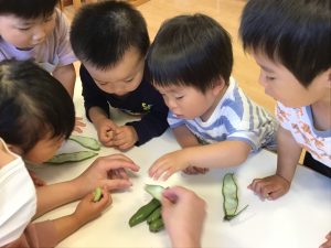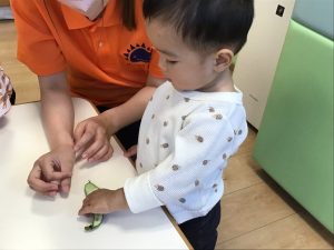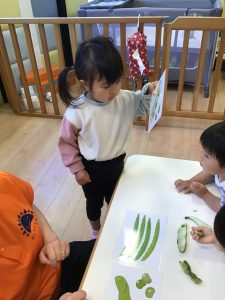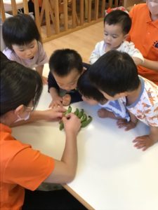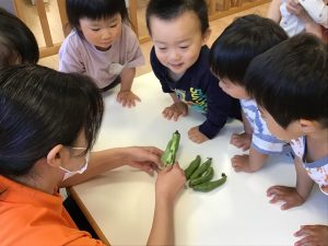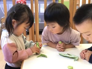保育士が持ってきたそら豆に興味津々な子どもたち🐣