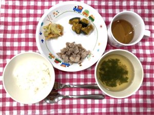 ごはん すまし汁 豚肉のマーマレード焼き 白菜の煮浸し ゆで南瓜