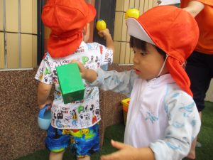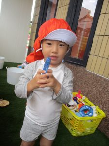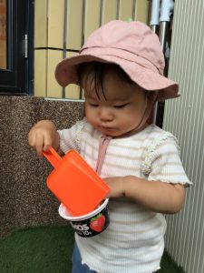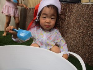 もも組さんは水の入ったバケツを手でバシャバシャしたり、スコップや容器を持って違うバケツを触って渡り歩いていましたよ!