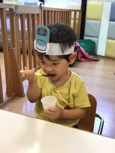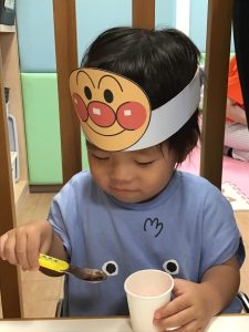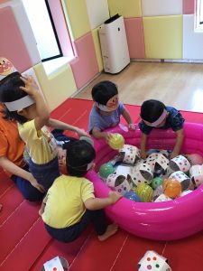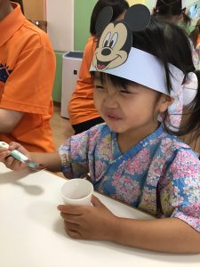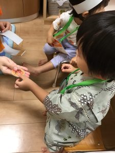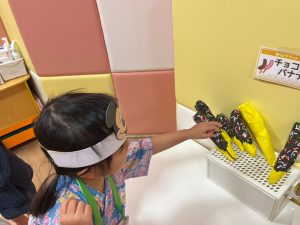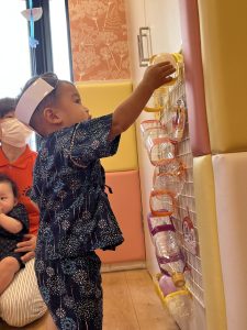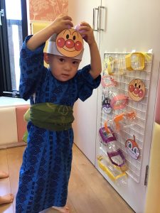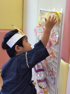 縁日の絵本を読んだ後は、お財布をもらってまずはお面のお買い物🎵