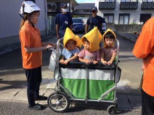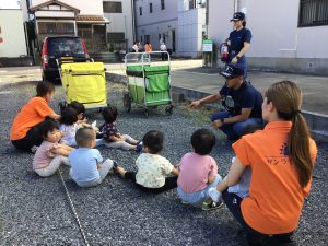 日陰を選んで消防士さんたちのお話しにしっかりと耳を傾けることができた子どもたち