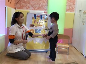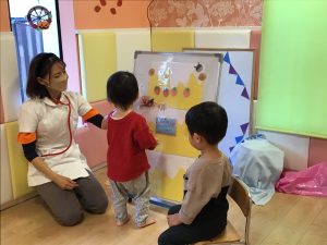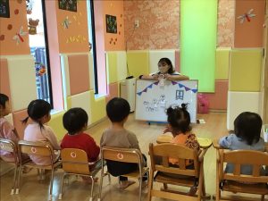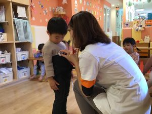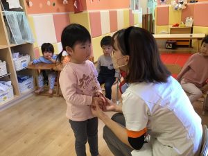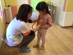 パネルシアターの後は、看護士に変身した保育者が聴診器をあててみんなが元気かみてみました!