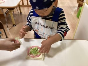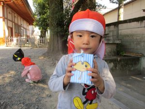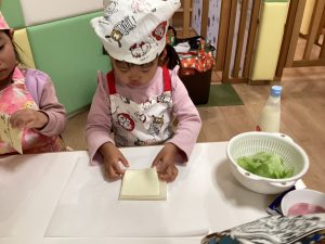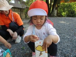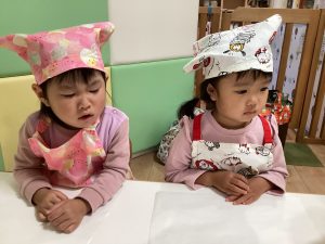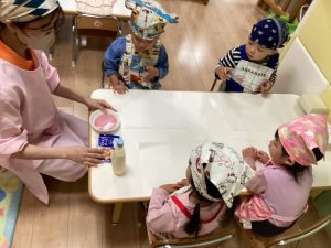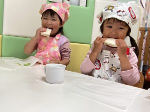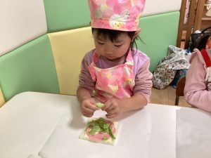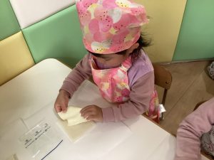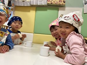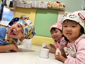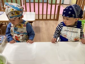 前日のお散歩でお買い物をしてきた2歳児さんたち