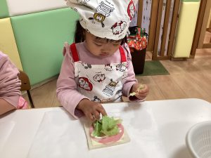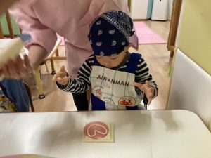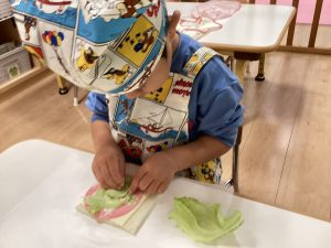 お気に入りのエプロンと三角巾持参に朝からワクワクの子どもたち