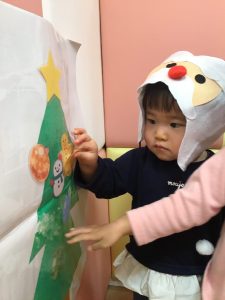 壁に貼ってある飾りを取って、ツリーにぺったん❗