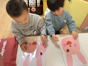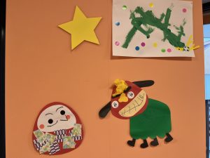 2歳児さんたちと一緒に作った「獅子舞」と「鏡餅」