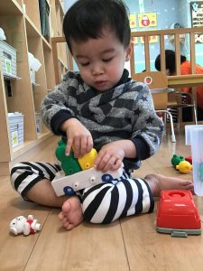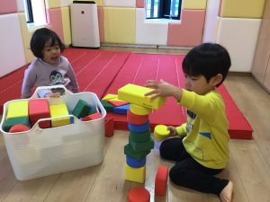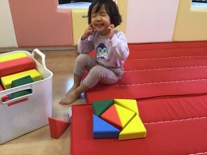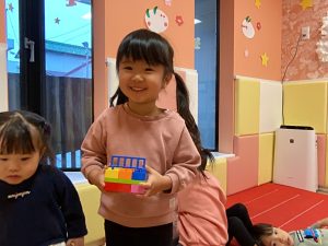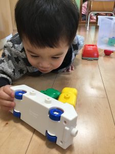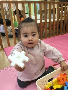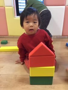 大きな飛行機をつくってみせてくれた2歳児さんは得意顔
