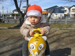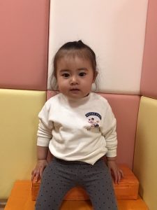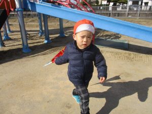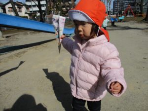 保育者の準備した紙飛行機✈を持つと、嬉しそうに走り出した2歳児さん
