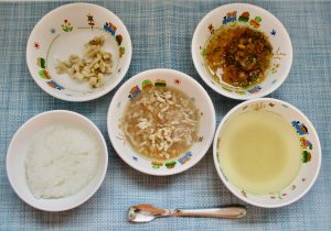(写真は普通食です。年齢によって盛り付け量を変えて、提供しています。)