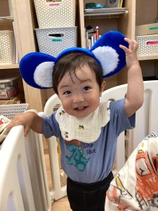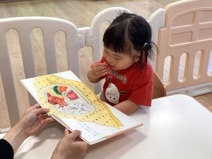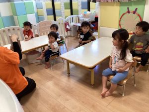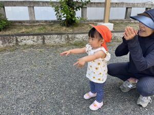 1歳児のお友だちが保育者の真似っこ