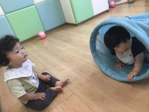 トンネルに興味を持ち始めた0歳児さん![]()