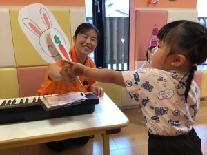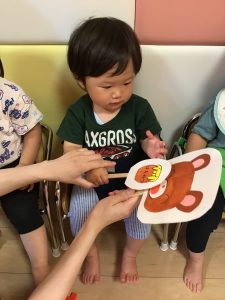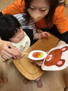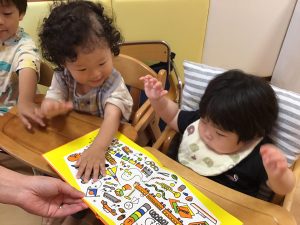 0歳児さんは保育士と一緒に、「どうぞ〜」