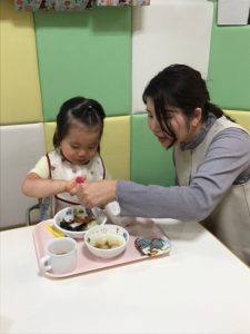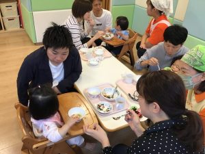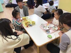 お母さん、お父さんと一緒の給食時間もご機嫌な2歳児さんたちでした😋💖