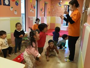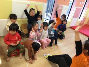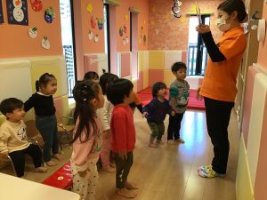 普段の生活の中でしている動作を英語で伝えていきます。保育者と一緒に身体を動かしながら伝えることで動作と単語が結びつきやすく単語への理解が深まります。