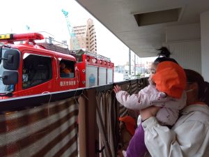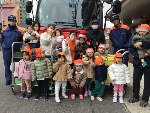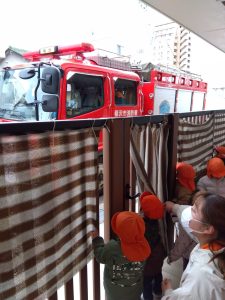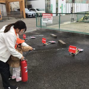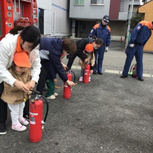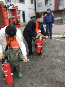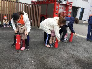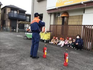 消防士さんのお話を聞き、1.2歳児さんは消火器の訓練にも参加しました!🧯