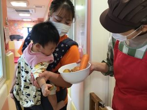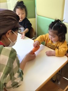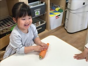 2歳児さんは「にんじんだよ!」「玉ねぎつるつる!」と知っていることを教えてくれたり、