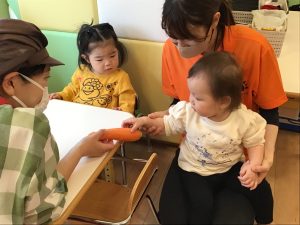 0歳児さんも、保育者と一緒に野菜に触れたり見つめたりして、五感で楽しむことができました︎︎👍