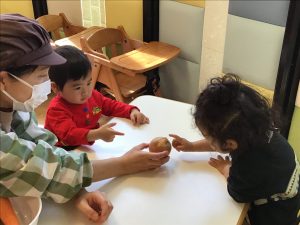1歳児さんは保育者と一緒ににおいをかいだり、そっと触れてみたりしてじっくり観察🧅