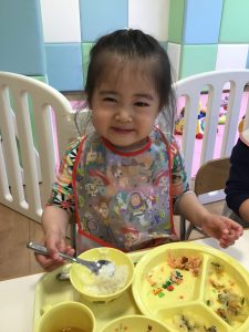 サンライズキッズ保育園 ◎給食の様子 たくさん遊んだあとは、お待ちかねのチキンナゲット♪「やったー!...