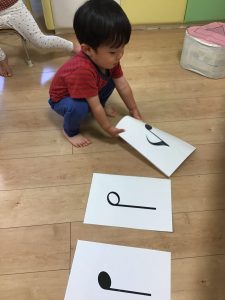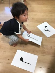 保育者が弾くピアノにリズムからこの3つを聞き分けてその音符のカードを選びます。