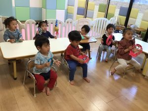 保育者の真似をしながらタンバリンをたたいたり、自由に鈴を鳴らしたり楽しそうでした💕