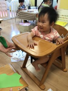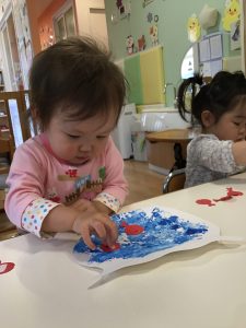 2歳児さんは大胆に手で絵の具をのばして、フィンガーペイントに挑戦!😆
