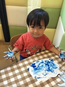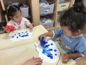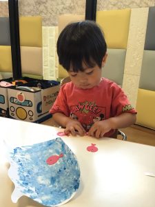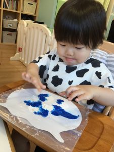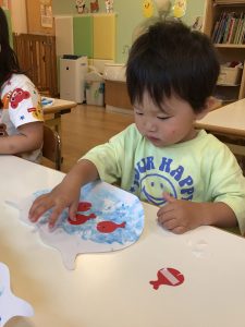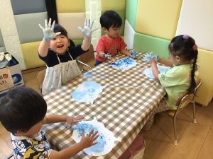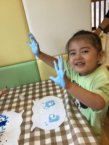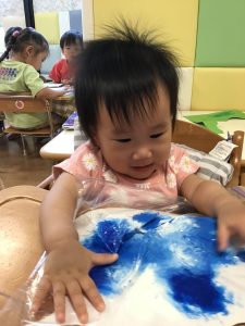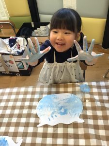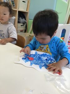 「手が水色になったよー!」と、絵の具の感触を楽しみながら水の中の世界を表現していました🐟