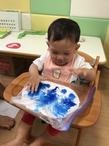 0歳児さんは、ジッパー付きの袋の中に絵の具と紙を入れて、袋の上から手で触れて遊びました✋