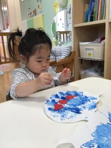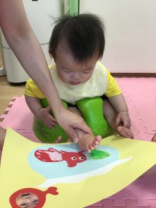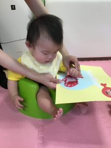 1歳児さんは「たんぽ」を使って、白い紙の上に絵の具をポンポンとスタンプ。