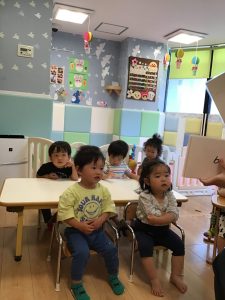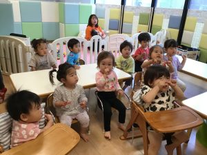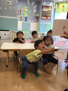 赤い点のカードを見ながら、「いち!」「じゅう!」と知っている数字を元気に言ってみたり、保育者のあとに続いて数を数えてみたりと、それぞれのペースで楽しんでいます😌