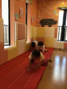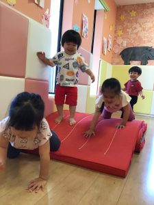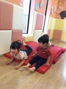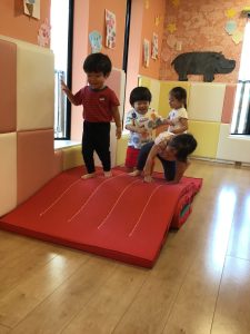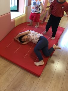 マットやトンネル、フープなど繋げてサーキット遊びも取り入れ体操の時間を楽しんでいますよ☺💕