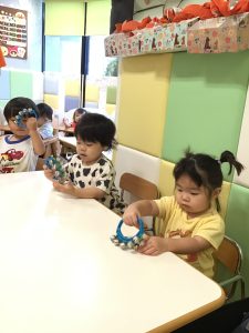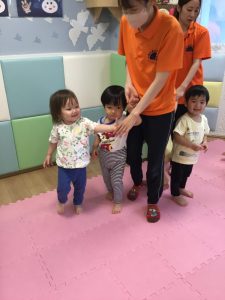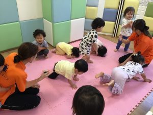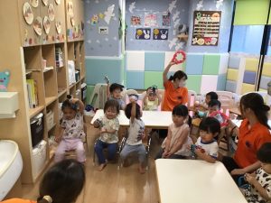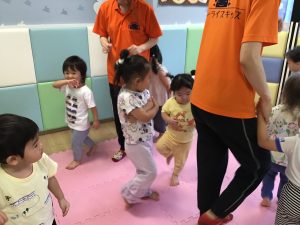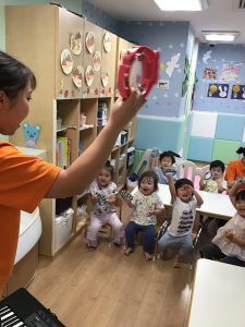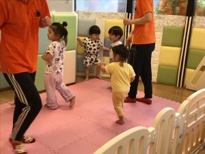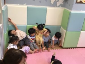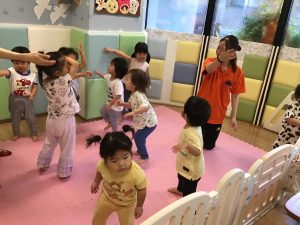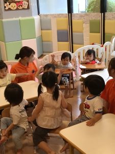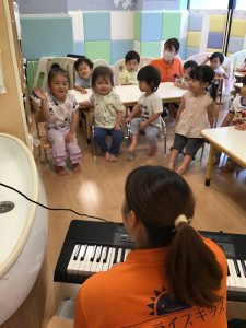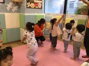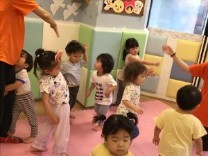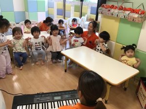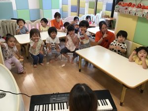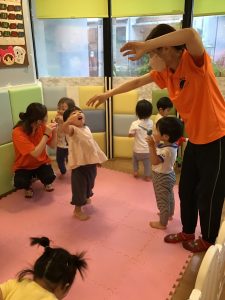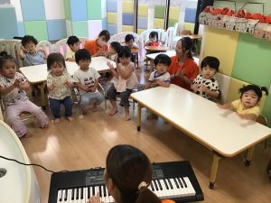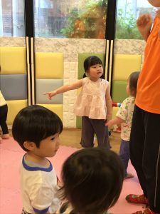 初めに挨拶をしたら、ピアノのリズムに合わせてお名前を呼んで呼ばれた子は元気に「はーい!」とお返事をします。