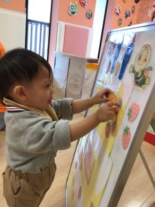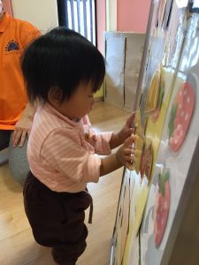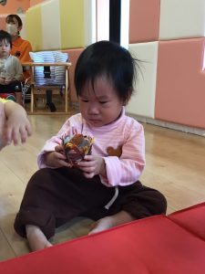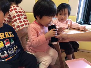 変身した食べ物をもらうと、嬉しそうに食べる真似をしたり、触ったりする子どもたち💓