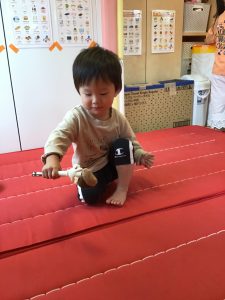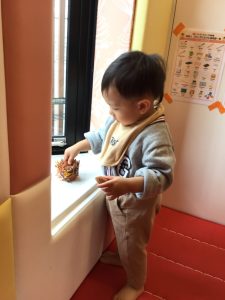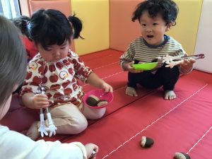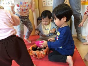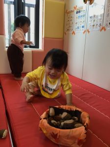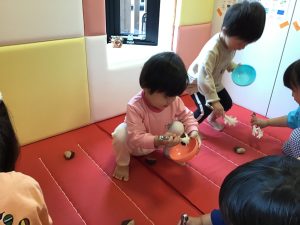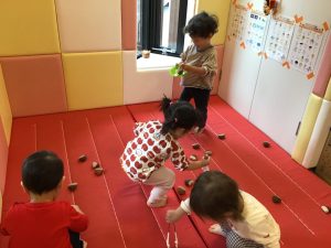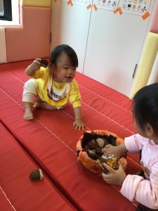 0歳児さんは保育者と一緒にあちこちにある栗を見つけて楽しんでいました✨