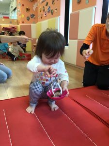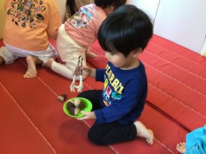 1・2歳児さんはトングとお皿を持って真剣に栗拾い!
