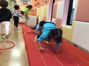 動物模倣ではしっかりとテープを意識して線の上を真っ直ぐクマ歩きする子どもたち🐻