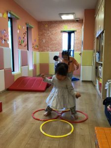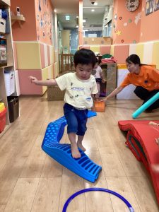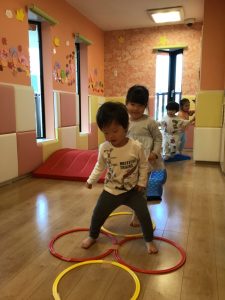 輪っかのフープを並べると上手にグーパーと両足で跳んでいますよ☺︎