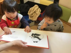 絵本を見ながら口を開けてみたり、手を動かして歯みがきの真似をしてみたりと、