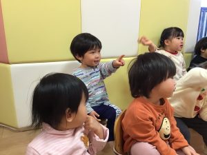おだいりさまやおひなさまが出てくると、「あ!」と指をさしたり、じっと見つめたりする子どもたち👀☝