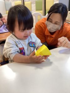1歳児さんは、折り紙をくしゃくしゃと丸めたり、手型取りを行いました✋