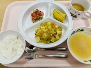 ご飯 味噌汁 厚揚げと野菜のカレースープ煮 ツナサラダ バナナ
