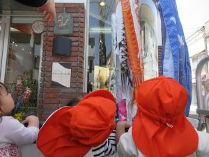 園児達の足で約20分、少し遠かったけど横断歩道も「ハーイ」と言いながら手を挙げてかっこよく渡る事が出来ました。大きなこいのぼ