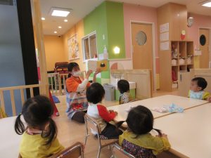 今日のお昼ご飯の前の読み聞かせは、みんなの大好きなご飯の絵本「いろいろごはん」でした。ご飯は、日本人の主食であり身近なものです。シンプルなご飯やお茶漬け、チャーハン、お寿司等みんなおいしそうなお米を使ったお料理に興味深々でした。その後、みんなで美味しくお昼ご飯を頂きました。みんな沢山ご飯を食べて大きくなってね。