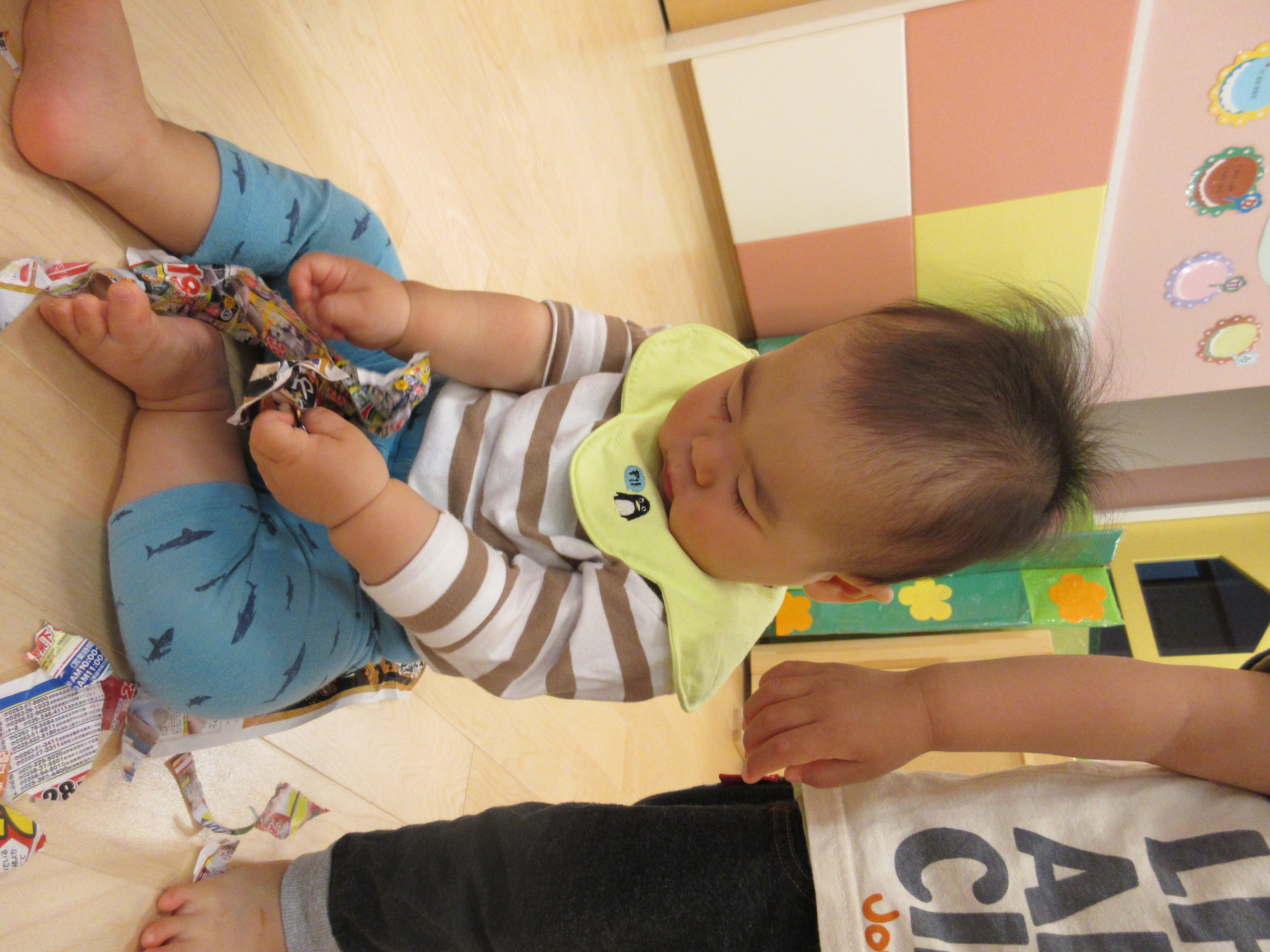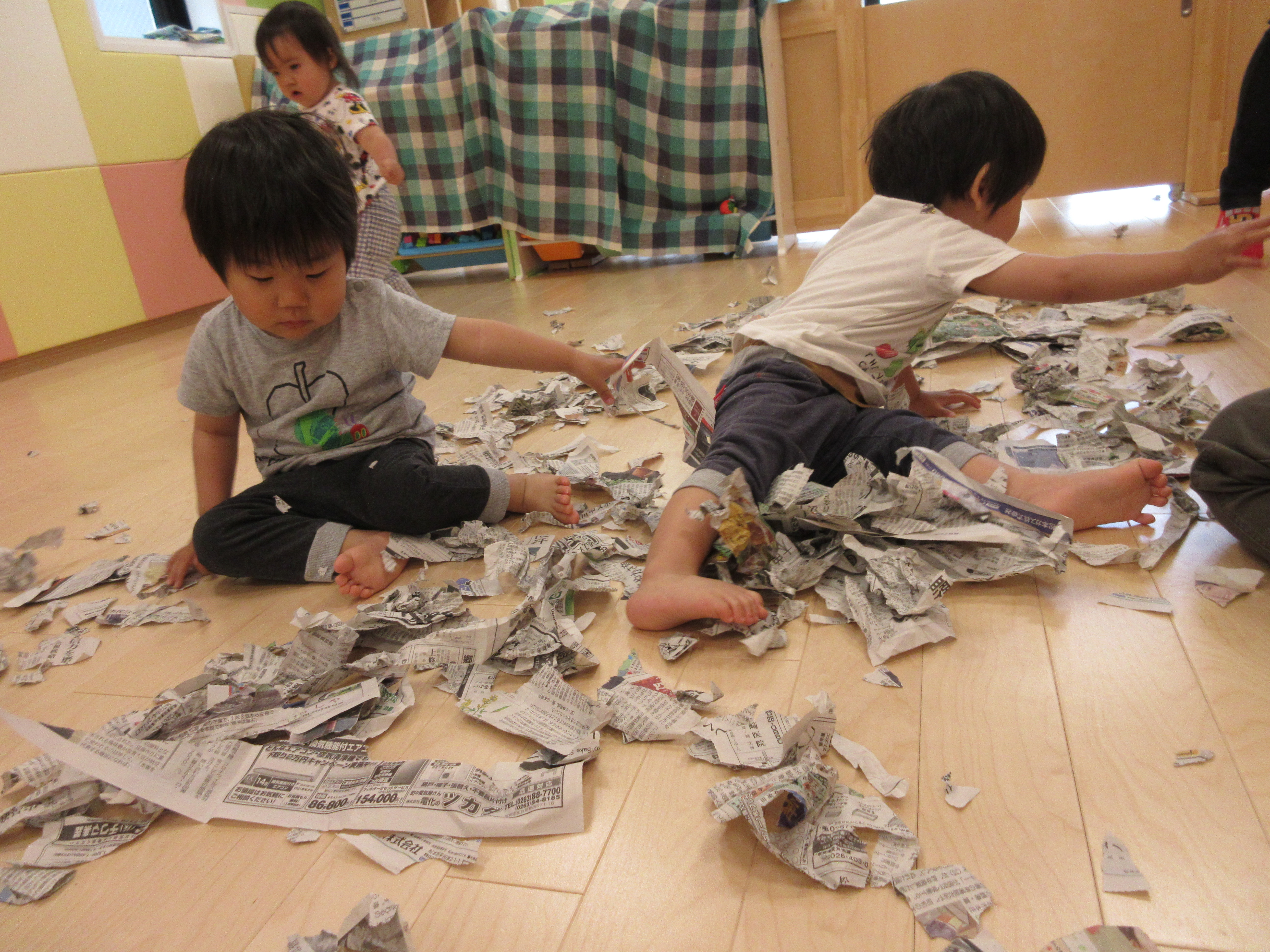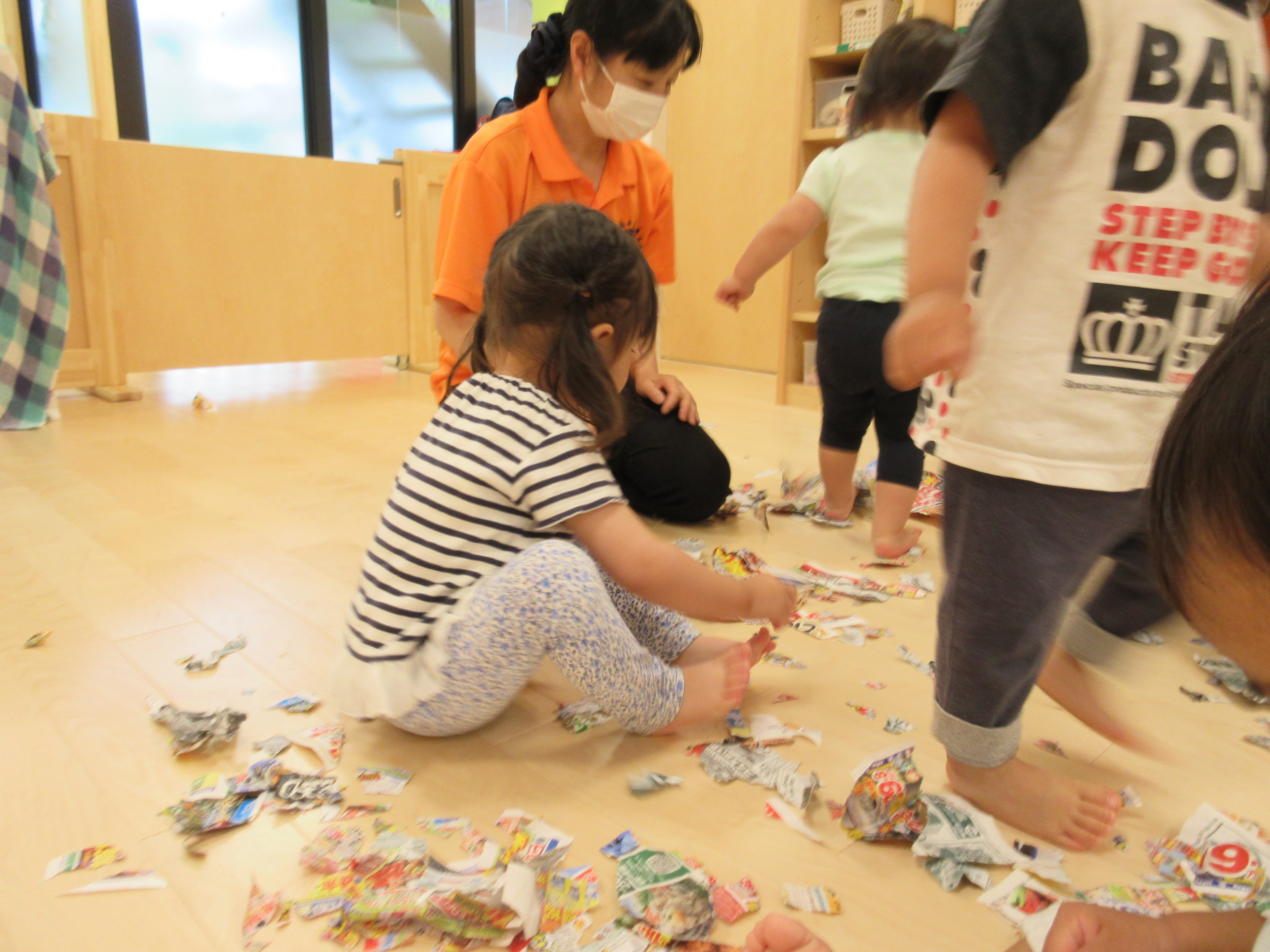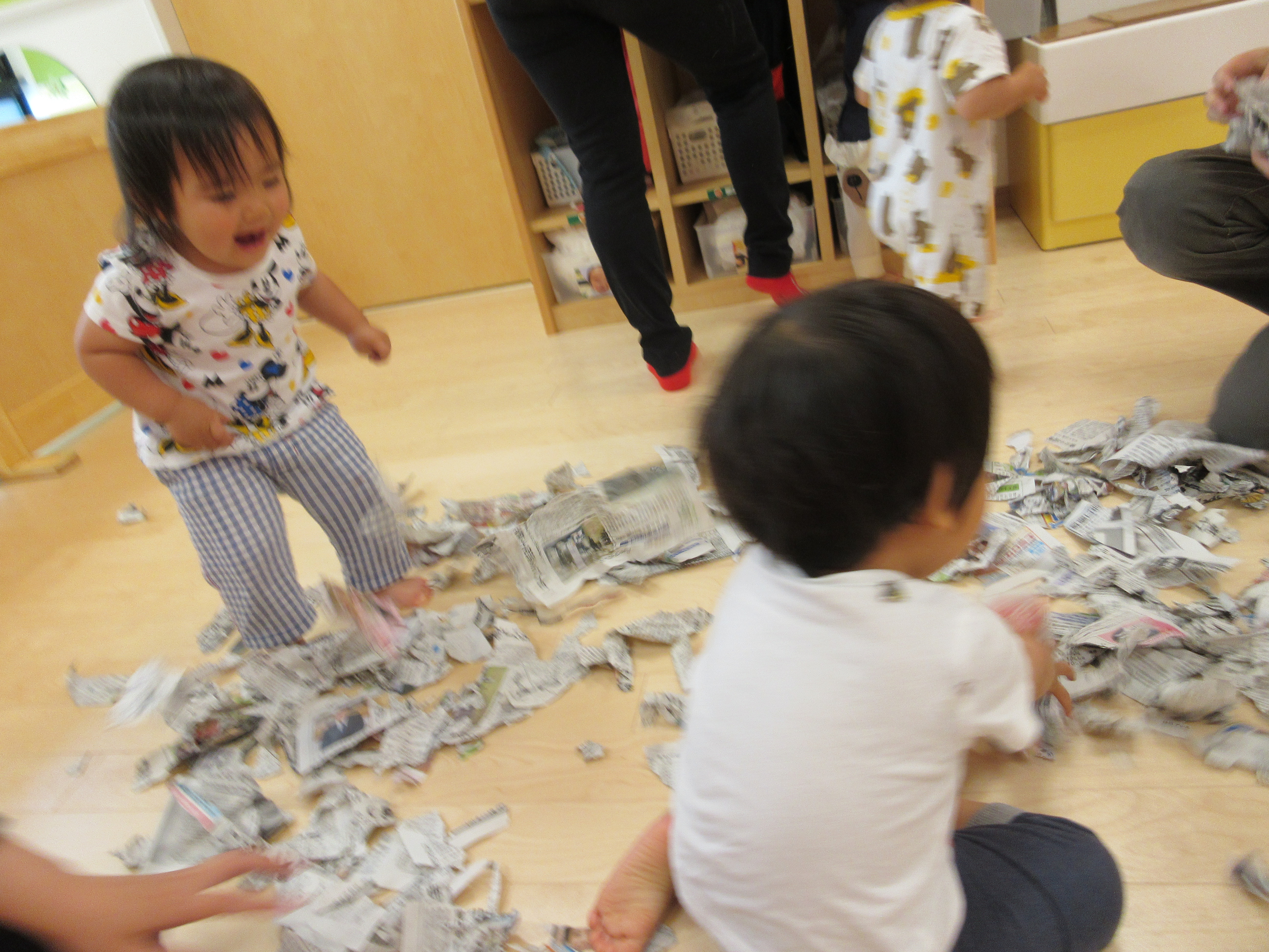 新聞紙遊びでは集中して小さく小さくちぎる子や保育者に上から「ひらひら」させてもらうのを楽しむ子もいました。