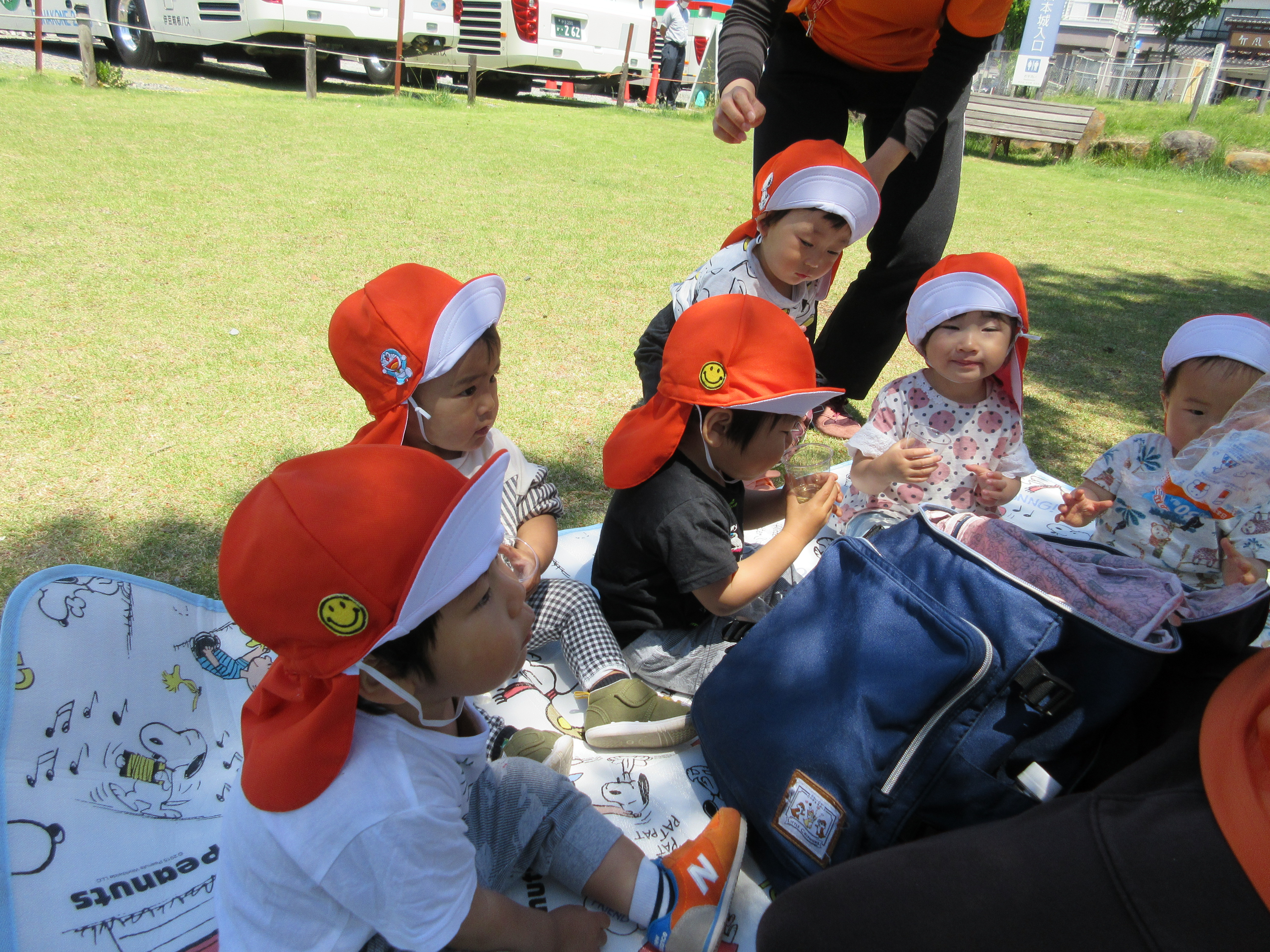 保育者がカバンを開けると自然とシートの上に集まって座ってくれます。