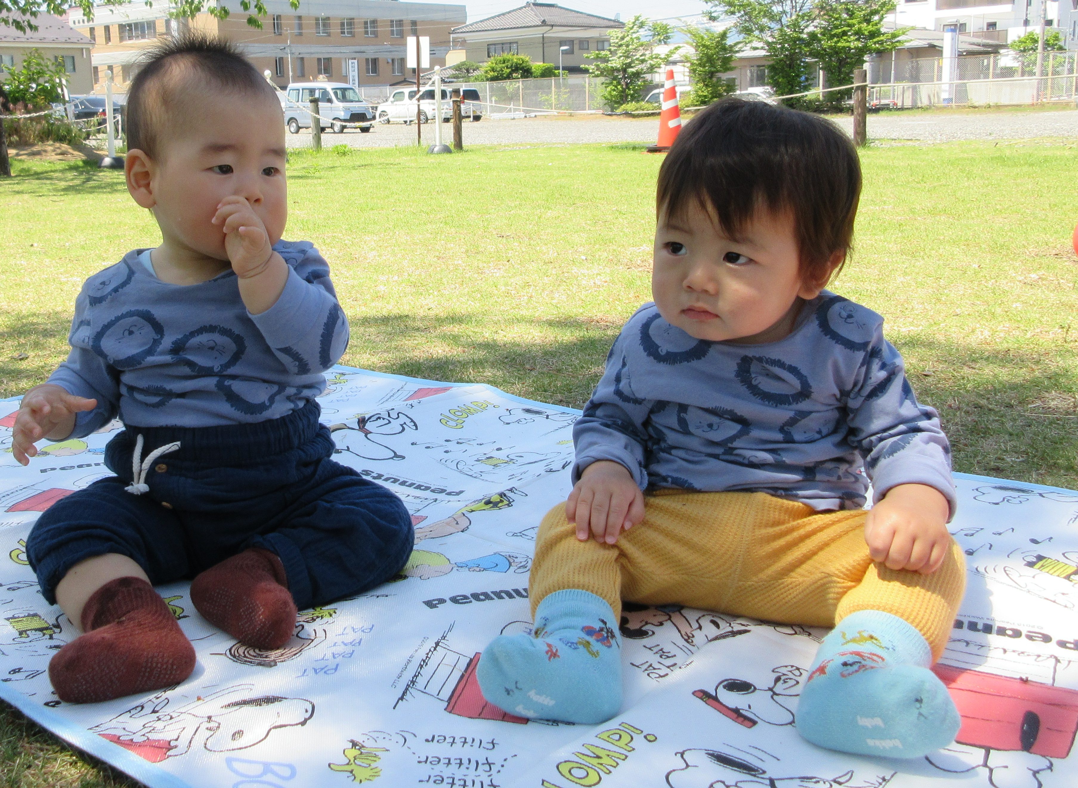 以前まではシートの上に座っていることが多かったのですが、最近では自分からシートを飛び出して芝生の上をハイハイしています。